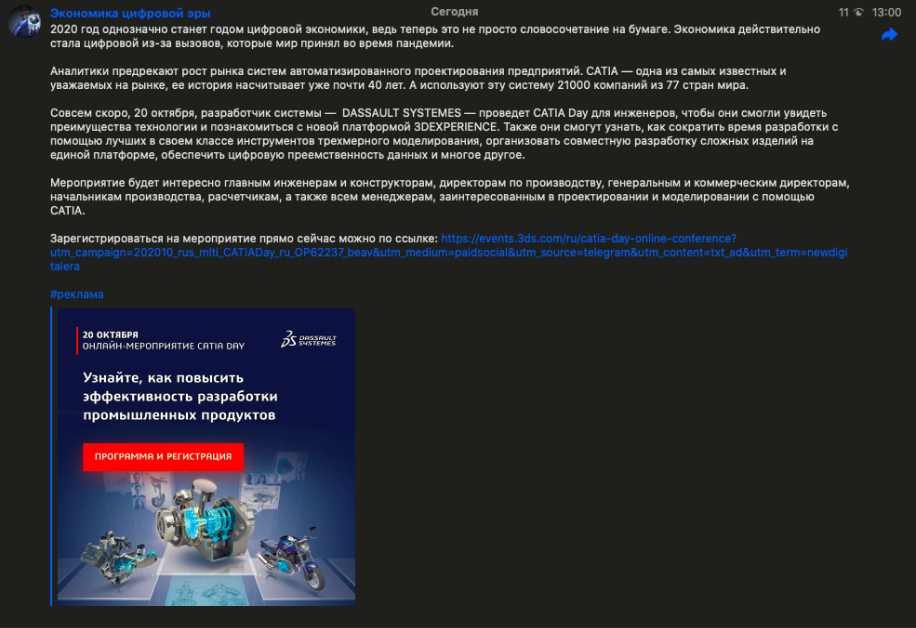 Например, для Telegram-канала «Экономика цифровой эры» мы подготовили два рекламных поста. Они выходили друг за другом с перерывом в два дня.